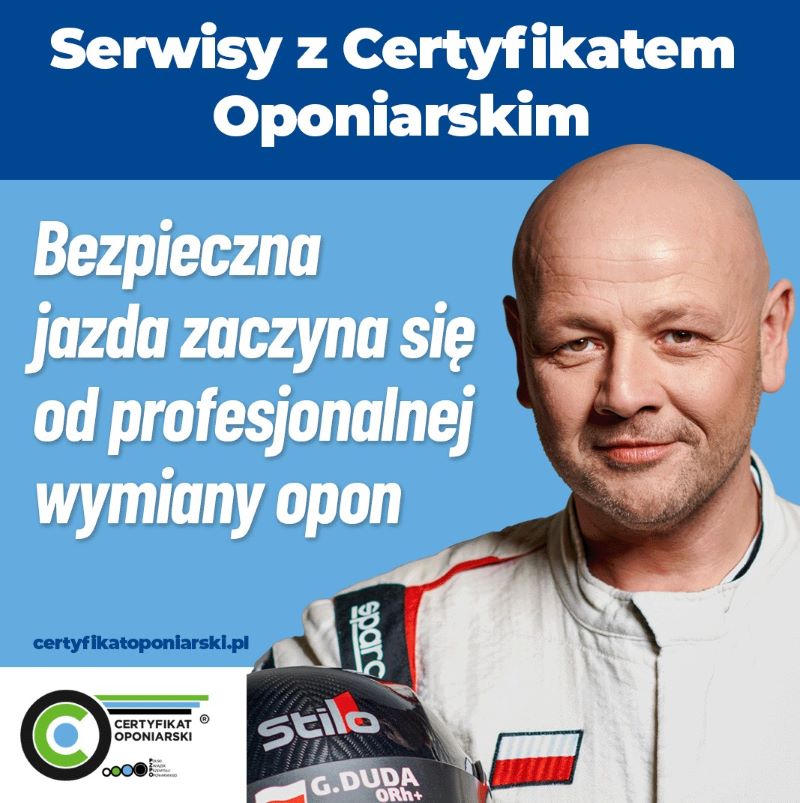 W całej Polsce można znaleźć tablice wskazujące serwisy z Certyfikatem – to kampania wspierana przez Grzegorza Dudę – kierowcę rajdowego i dziennikarza motoryzacyjnego, a przy tym inżyniera-mechanika samochodowego, który dokładnie wie, jak wielki wpływ ma jakość opon i prawidłowy serwis na bezpieczną jazdę.